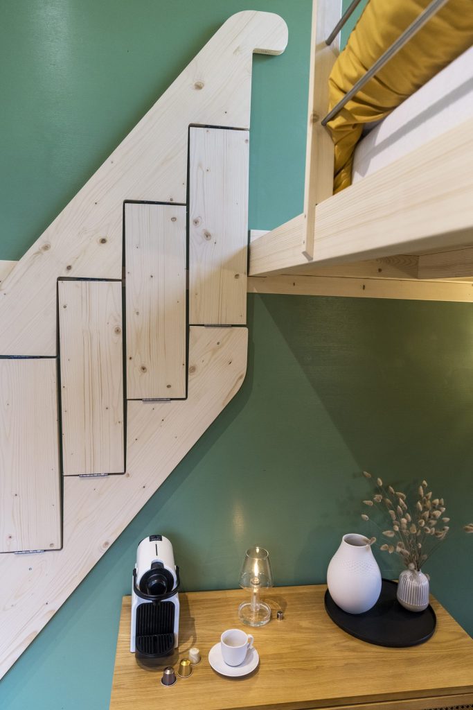 L’intérieur de la Tiny House est agencée avec goût et astuce. Il comprend :